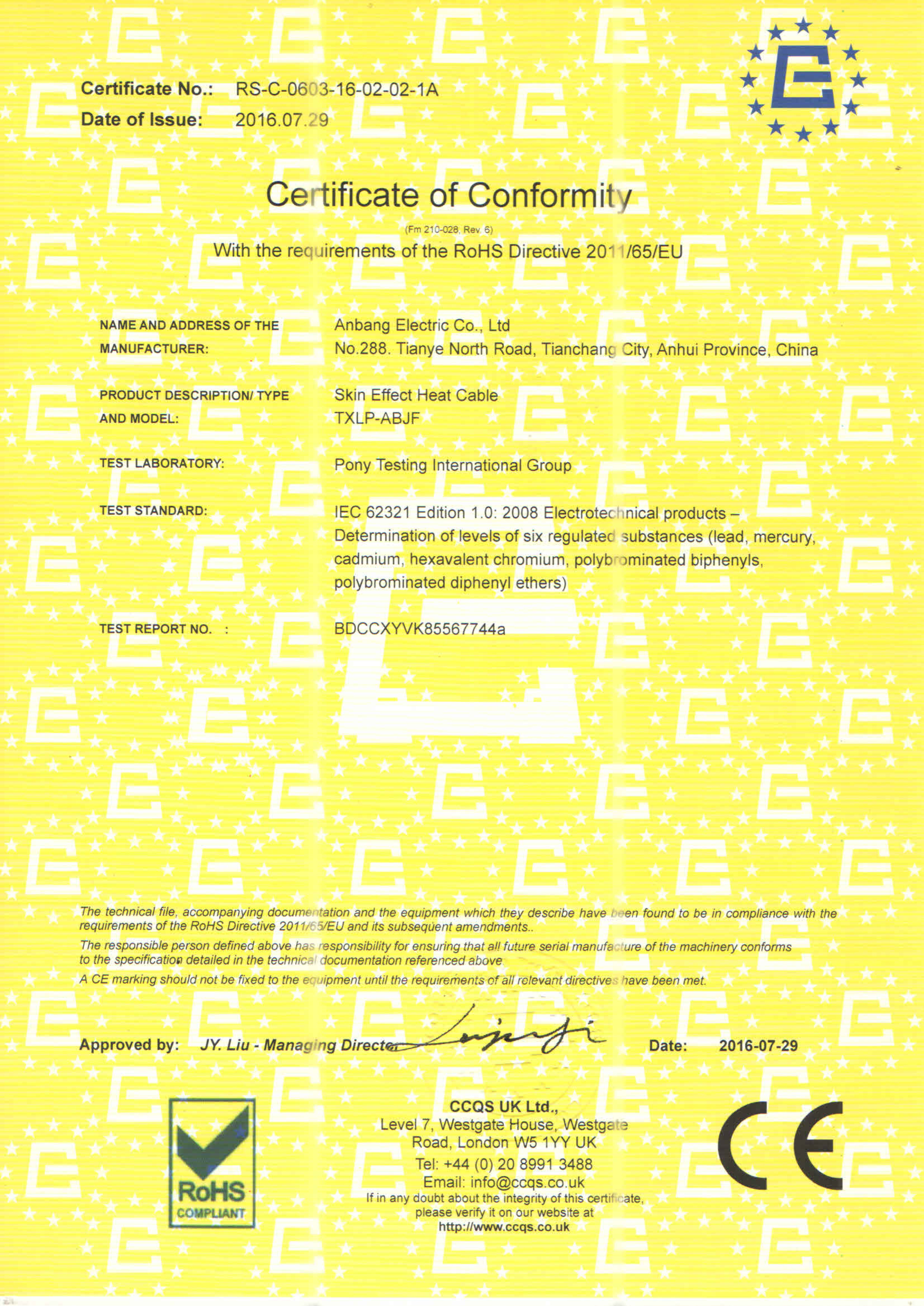 安邦電氣股份有限公司,總部位于北京市長安街,成立于2004年,注冊資金10088萬。安徽生產基地占地面積63000平方米,擁有66套各類生產線,其中進口生產線6套。國家高新技術型企業,滁州市市長質量獎企業,專精特新“小巨人”企業,擁有國家知識產權局授權的45項專利,其中發明專利28項 , 主筆《太陽能熱利用自限溫電熱帶安裝規范》行業標準,參編《自限溫電伴熱帶》國家標準、《工業和商業用電阻式伴熱系統》國家標準、《太陽能熱利用自限溫電熱帶》行業標準、《爆炸性環境 電阻式伴熱器》國家標準等7項國家標準。企業通過UL認證,國家強制性 CCC產品認證,ISO9001質量管理體系認證,ISO14001環境管理體系認證,ISO45001職業健康安全管理體系認證,Q/SHS0001.1健康、安全與環境管理體系認證,歐盟防爆ATEX認證,歐盟CE認證,RoHS認證,俄羅斯海關聯盟認證,國家防爆電氣CCC證書。產品系列:集膚伴熱系統、電伴熱系統、電加熱器、電地暖系統、集儀器儀表、電線電纜、高低壓配電柜(箱)、電纜橋架、閥門管件等等設計、制造、銷售。產品應用于航天航空、軍工、石油、石化、天然氣、機場、化工、鋼鐵、隧道、消防、養殖、融雪化冰、室內供暖、國家電網及眾多電廠等等國家重點工程。出口美國、英國、德國、俄羅斯、韓國、日本、哈薩克斯坦、烏克蘭、伊朗等眾多國家。